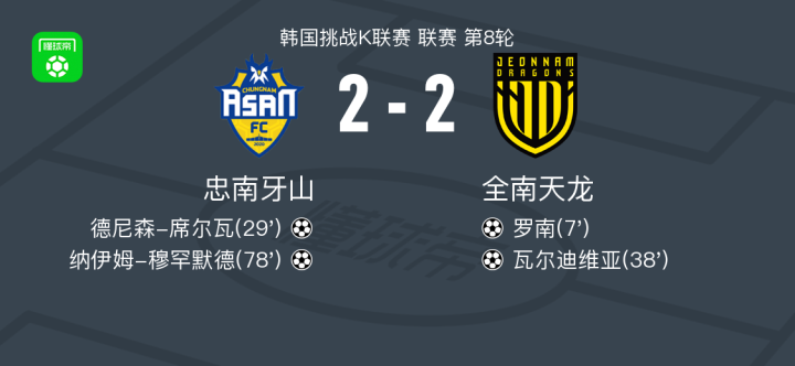 北京时间4月19日韩国挑战K联赛 联赛 第8轮,忠南牙山主场对阵全南天龙。忠南牙山德尼森-席尔瓦破门,纳伊姆-穆罕默德破门。全南天龙罗南破门,瓦尔迪维亚破门。最终比分忠南牙山 2-2 全南天龙。