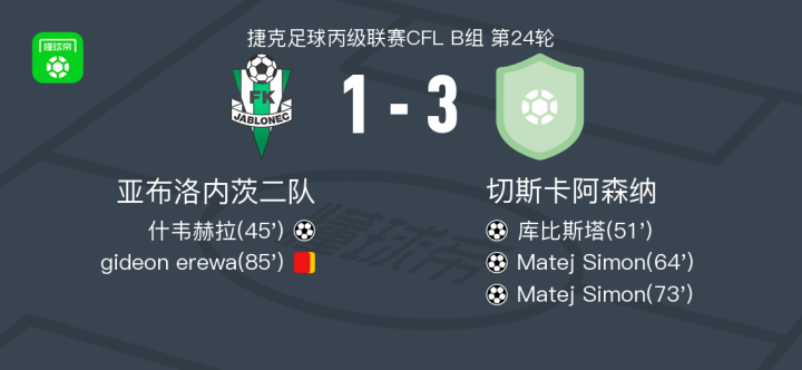 北京时间4月19日捷克足球丙级联赛CFL B组 第24轮,亚布洛内茨二队主场对阵切斯卡阿森纳。亚布洛内茨二队什韦赫拉破门。切斯卡阿森纳库比斯塔破门,Matej Simon梅开二度。最终比分亚布洛内茨二队 1-3 切斯卡阿森纳。
