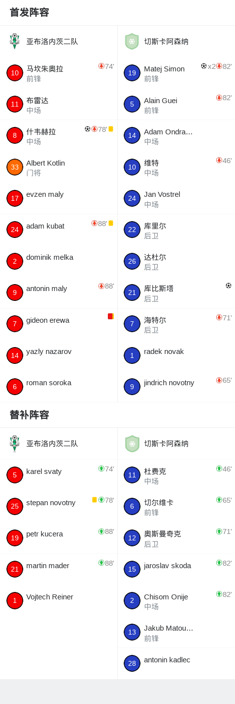 第85分钟,亚布洛内茨二队球队gideon erewa吃到第二张黄牌。