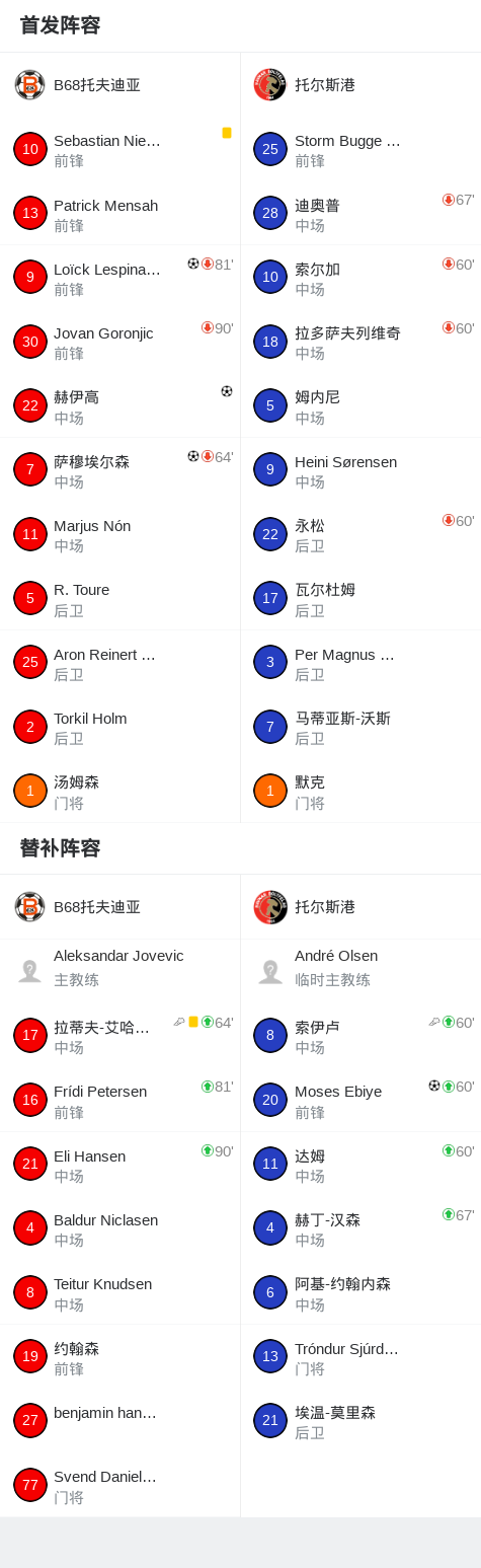 第1分钟,B68托夫迪亚球员萨穆埃尔森打入一球。