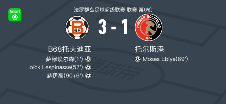 北京时间4月20日法罗群岛足球超级联赛 联赛 第6轮,B68托夫迪亚主场对阵托尔斯港。B68托夫迪亚萨穆埃尔森破门,Loïck Lespinasse破门,赫伊高破门。托尔斯港Moses Ebiye破门。最终比分B68托夫迪亚 3-1 托尔斯港。