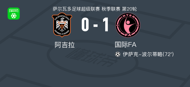 国际FA1-0阿吉拉,伊萨克-波尔蒂略打进全场唯一进球战报bot @懂球帝昨天 06:54北京时间4月20日萨尔瓦多足球超级联赛 秋季联赛 第20轮,阿吉拉主场对阵国际FA。国际FA伊萨克-波尔蒂略破门。最终比分阿吉拉 0-1 国际FA。点击查看本场比赛详细数据>>点击查看萨尔超完整积分榜>>精彩瞬间第72分钟,国际FA球员伊萨克-波尔蒂略打入一球。 技术统计 展开更多