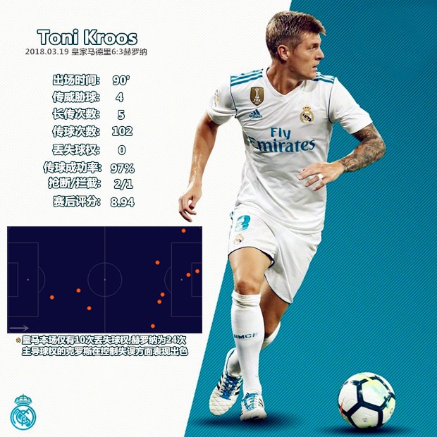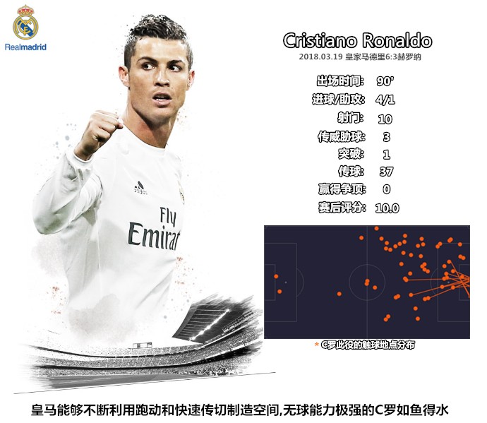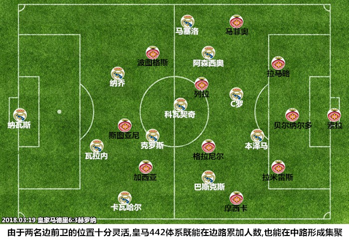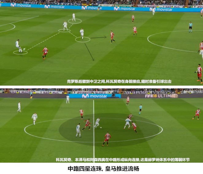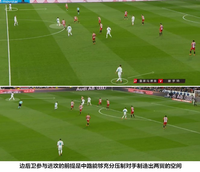 一是克罗斯主导的拉沃尔佩出球体系保证了较高的传球成功率,在其身前的科瓦契奇可以有效地利用跑动为其创造空间,两人形成一个前后站位、覆盖180度视角的传跑引擎;二是在赫罗纳3421体系内担任中前卫的两名球员缺少足够强大的扫荡能力,科瓦契奇、阿森西奥和本泽马能够在中路构建起纵向链条,皇马在中场不但能够形成人数优势,还能利用一脚传递快速突防,创造快攻机会;三是巴斯克斯和C罗跑动覆盖效果很好,两名球员分居两翼很好地利用了赫罗纳两名翼卫身后的空间,皇马一旦成功通过中场就能形成很好地的进攻层次。