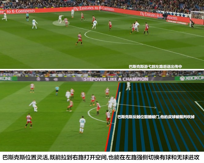 齐达内打乱前场建制以驱动压迫和传切的思路,要求每一名球员都要具备跨区作战的能力,在利用中路传切就能撕开防守的情况下,边路传中已经不是进攻支援时的主要方式。阿森西奥将很大一部分精力用在中场串联和输送环节,巴斯克斯内收之后通过大量的跑动为其提供传球点,两人在纵向空间上的配合与克罗斯和科瓦契奇如出一辙,这种多环相扣、强打中路的方式让中卫和后腰实力较弱的赫罗纳十分难受。