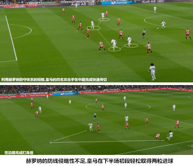 在前场集聚火力的同时强化反抢,把对手的进攻扼杀在初始阶段,无疑是一种高端的、攻守兼备的理想状态。赫罗纳最为值得钦佩的一点是,他们在易边后逼抢力度下降时也没有完全退守禁区,而是继续将重心放在中场与皇马实施正面对抗。