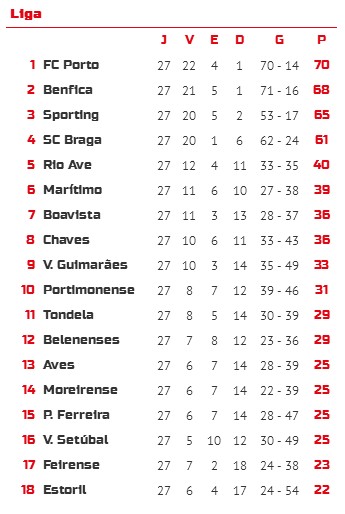 传统三强全部取胜,波尔图以2分优势领跑。在输掉同城德比之后,博阿维斯塔降到了联赛第7位,费拉人和埃斯托里尔位于保级区。
