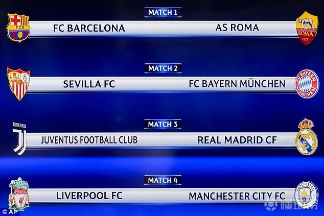 小草欧冠1/4淘汰赛抽签结果已经出炉:巴塞罗那VS罗马;拜仁慕尼黑VS塞维利亚;尤文图斯VS皇家马德里;利物浦VS曼城。