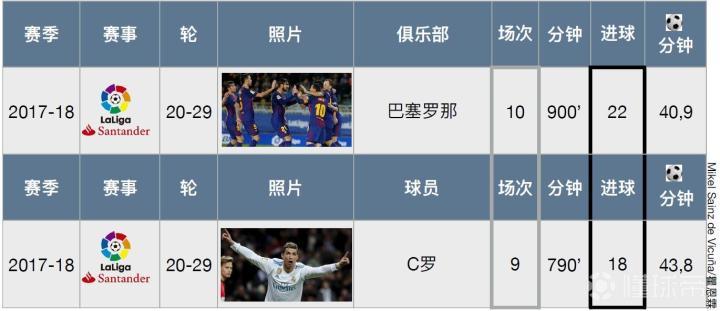 这样算来,巴塞罗那全队在联赛下半程每一粒进球所需要花费的时间是40.9分钟,而C罗则是43.8分钟。