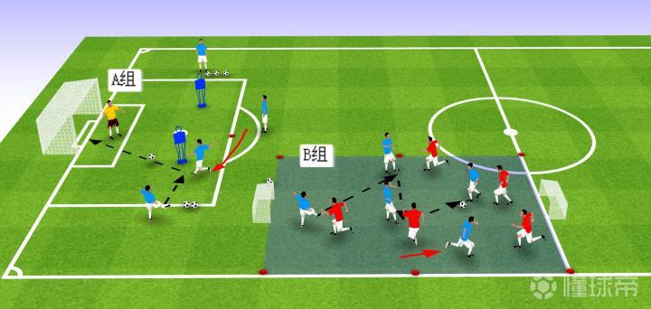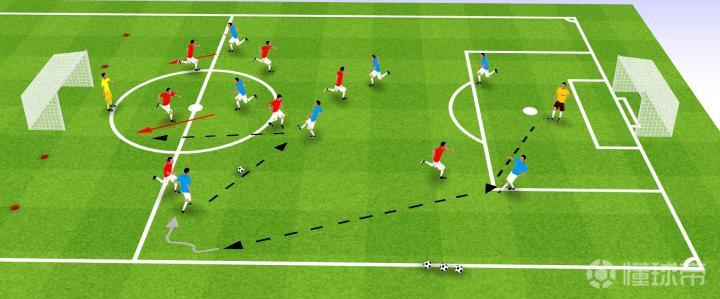 2)B组(其余球员):进行小场地比赛,根据具体人数设定,目的是控球。两队只有经过5次传递后才能射门。