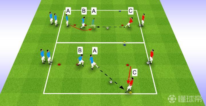 1)球员进行分组,每组三人。训练开始前球员A站在球员B身后3米处的红色标志盘,球员C站在球员B对面的红色标志盘处。在球员C两侧8米处设置蓝色和黄色的标志盘。