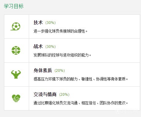 2)比赛球员:半转身面向球场以便于观察其他球员;积极跑动创造空间;快速的传接球。