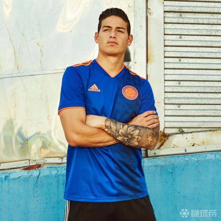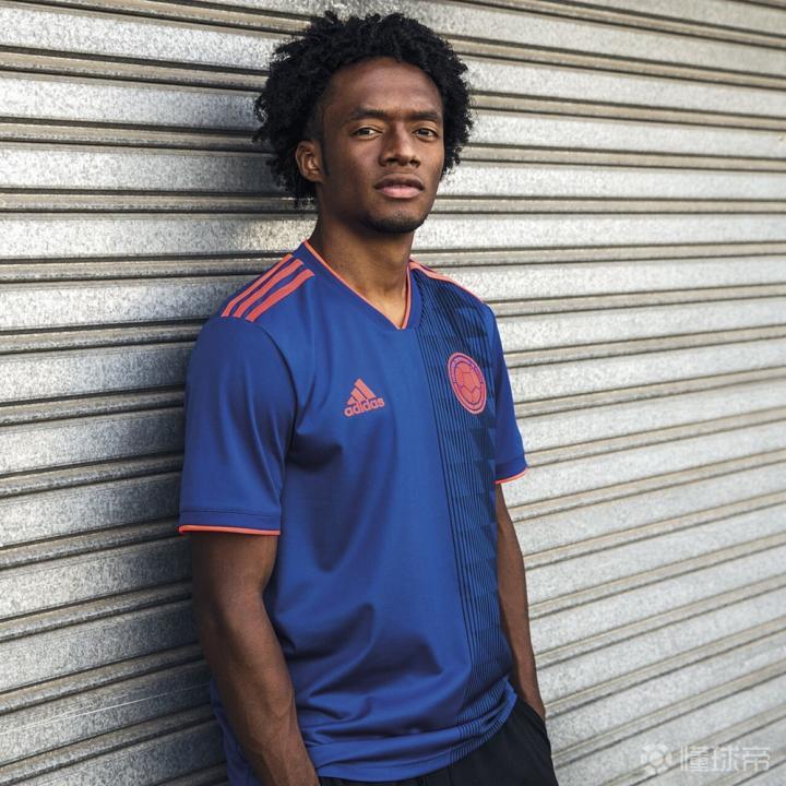 哥伦比亚全新世界杯客场球衣采用源自哥伦比亚人在庆典时刻佩戴的蓝色围巾为灵感,用蓝色球衣搭配复古锯齿花纹,并加入亮眼橙色元素装饰。球衣衣领后加入“Unidos Por Un Pais”(众志成城)字样。