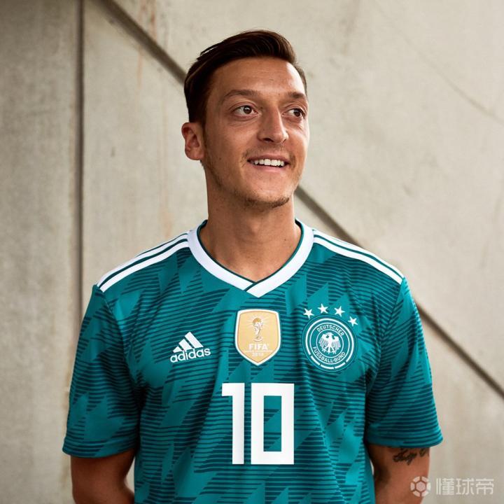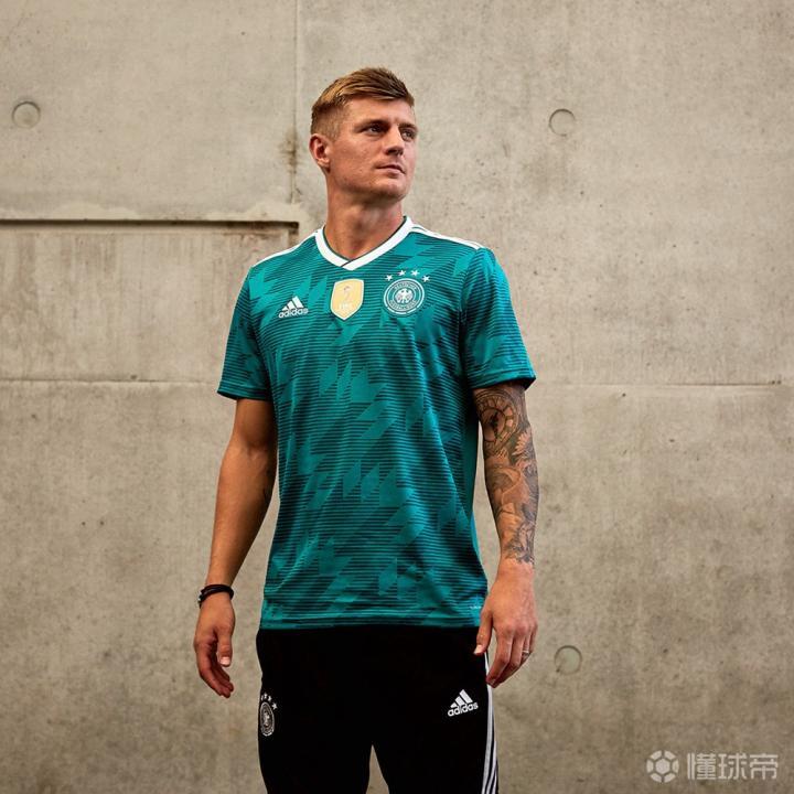 德国国家队全新世界杯客场球衣灵感源于1990年世界杯客场球衣的经典设计,通过现代手法重新演绎那件经典的绿色战袍。球衣正面加入复古且现代感十足的锯齿花纹,并在衣领后加入球队昵称——“Die Mannschaft”(团队)。