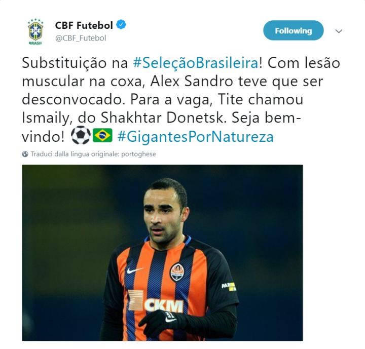 巴西足协在官网确认,尤文图斯边卫阿莱士-桑德罗因伤退出国家队集训,巴西国家队补招顿涅茨克矿工边卫伊斯梅利。
