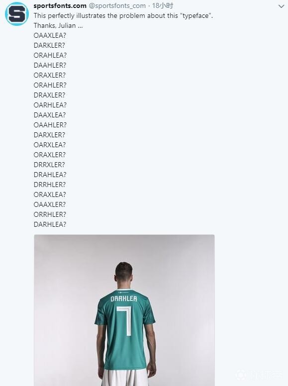 阿迪达斯在去年11月份就发布了2018年俄罗斯世界杯球衣字体,这一源自前苏联时期宣传海报的字体充满了浓浓的复古味道。不过在德拉克斯勒上身印有自己名字的球衣后,专注于球衣印字的网站sportsfonts.com就在其社交媒体账号上发布了“OAAXLEA?DARKLER?ORAHLEA?DAAHLER?ORAXLER?ORAHLER?DRAXLER?……”的花式吐槽。