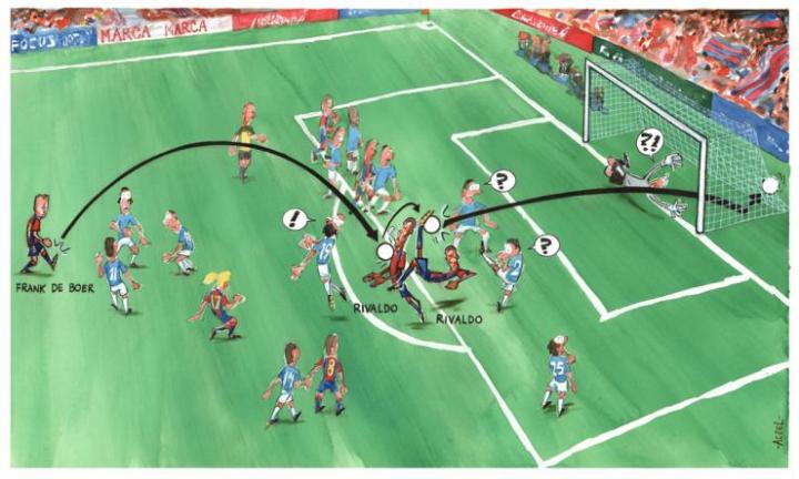 3年后,还是德波尔的传球,防守的球员还是阿亚拉。但这次,击败他的却是另一种完全不同的方式。荷兰人将球挑向大禁区,而里瓦尔多正在向大禁区外移动。两名巴伦西亚的防守球员紧贴瓦刀。巴西人弓起自己的身子,胸部将球停向半空中。巴伦西亚的后卫们反应慢了也就半秒钟,但还是太迟了。里瓦尔多已经获得了足够的起脚空间。但如果你看这一时刻的照片,里瓦尔多还是被紧紧包围着,就像1982年马拉多纳对阵比利时射门时那张著名的照片一样。