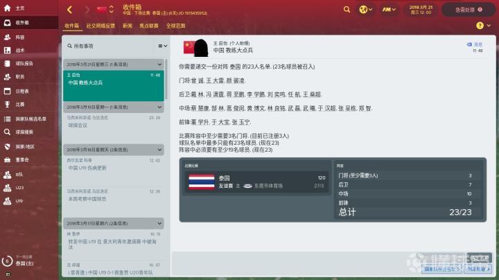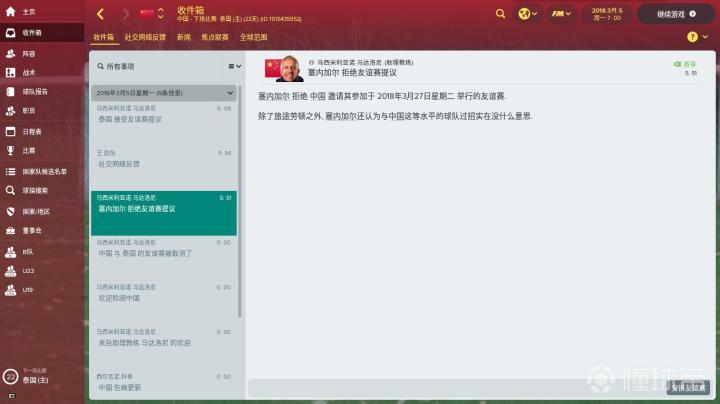 开档后,中国男足预先设定的赛程只有3月27日与泰国的友谊赛。但是出于想要和强队过招的想法,我取消了泰国友谊赛转而选择以塞内加尔为对手进行友谊赛。但是......塞内加尔由于我们中国实力不足拒绝了友谊赛的提议。所以我最终还是恢复了和泰国的友谊赛赛程。