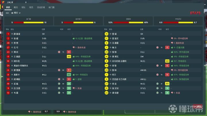 球队的全场摘要,你在比赛中考察球员时要重点看。这个页面最直观地给玩家展示了所有上场的球员中谁踢得好,谁踢得差。