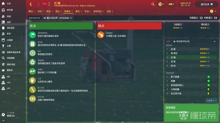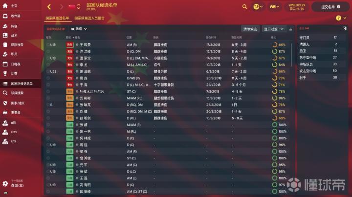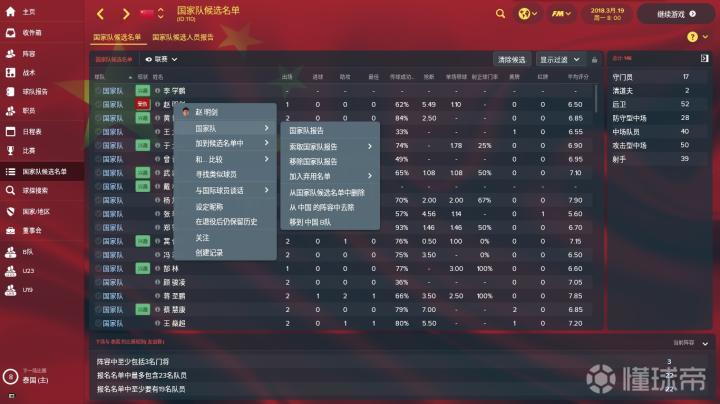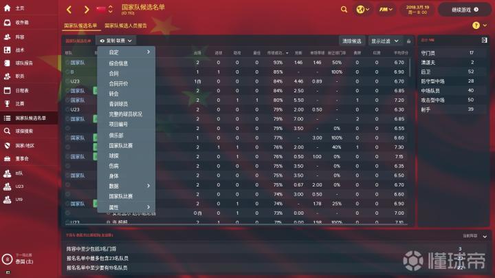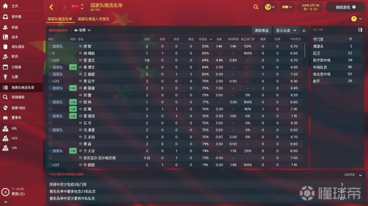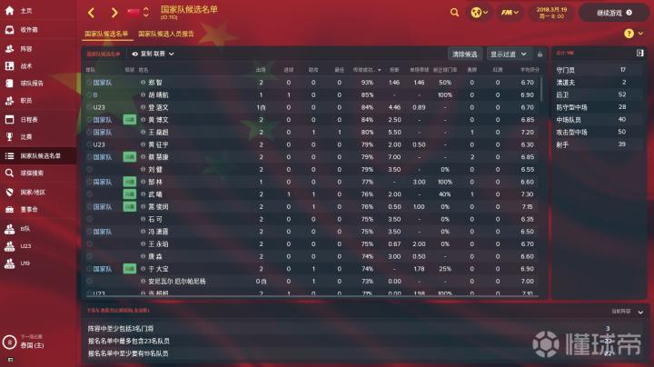 上图是国家队候选名单界面。球队从国家队位置层面分为国家队成员、国家B队成员、国奥队成员、U19成员和边缘国脚这五大类型。