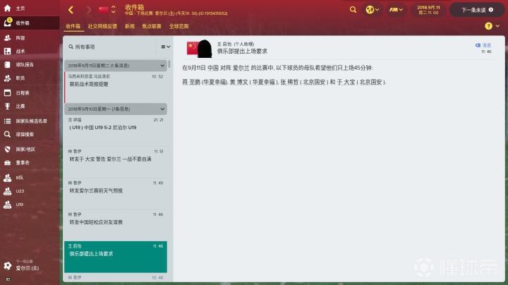 3.关于年轻球员。虽然你在游戏中执教的是成年国家队,但是不代表你就一点也不关注国奥队、U21、U19等梯队国家队的比赛。国家队的流动性非常大,而且对于年轻球员的需求不是一点也没有的,适当地关注并选拔年轻球员,可以帮助你的国家队阵容适度年轻化,而且可以增强年轻球员的视野,逐渐适应成年国家队的比赛强度。