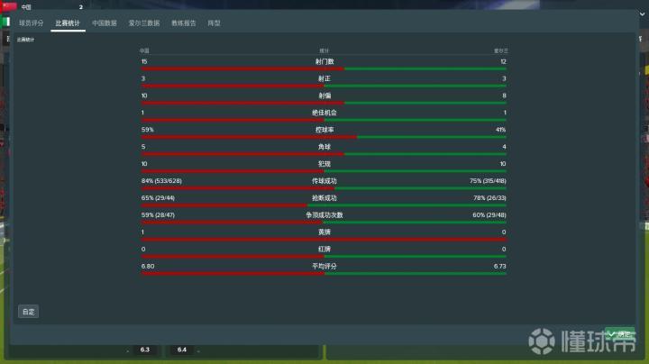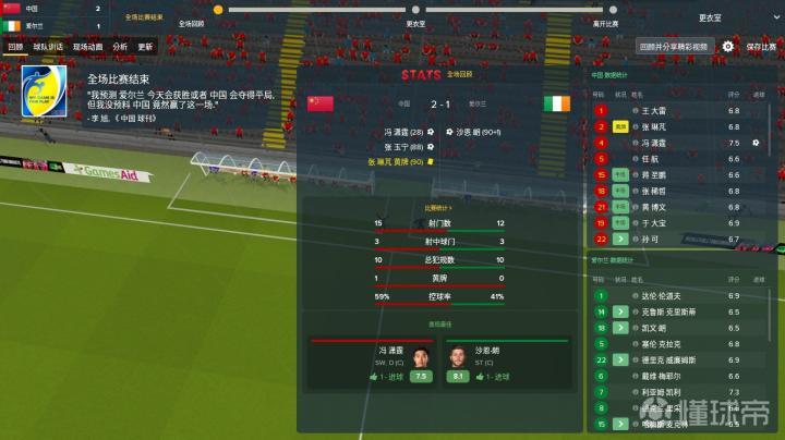 比赛的结果出乎我的预料。我在游戏中居然带领中国队击败了在游戏中世界排名第35的爱尔兰!各项数据都领先于对手,尤其是传球成功率,居然高达84%!冷静地分析了一下,我觉得有几点原因促使中国在这次模拟中取得了胜利: