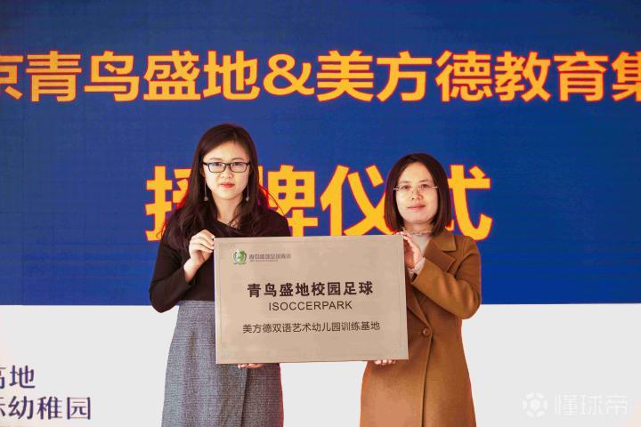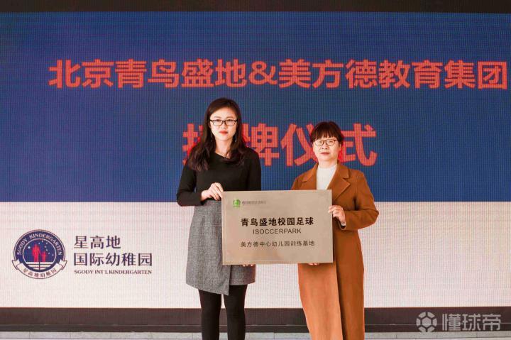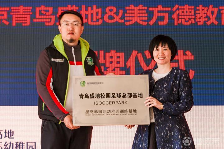 青鸟盛地董事副总经理毛阔先生和美方德教育集团董事长康英杰女士共同为星高地国际幼稚园训练基地授牌青鸟盛地校园足球总部基地