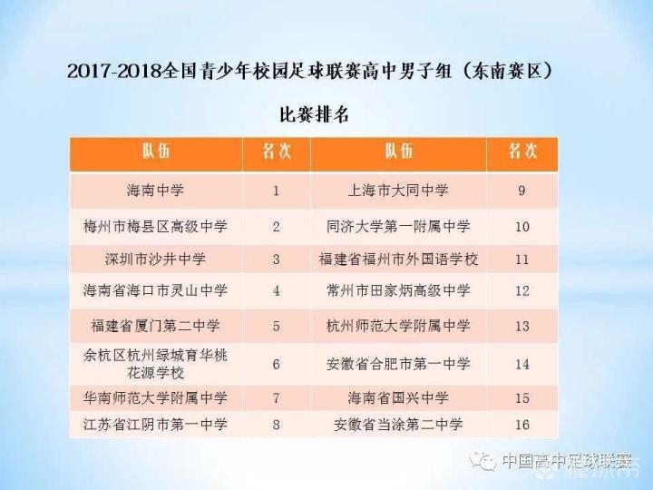 3月22日,2017-18全国青少年校园足球联赛高中组(东南大区)落幕,海南中学在决赛中1:0击败梅州梅县高级中学摘下大区桂冠,深圳沙井中学5:2战胜海口灵山夺得第三名。