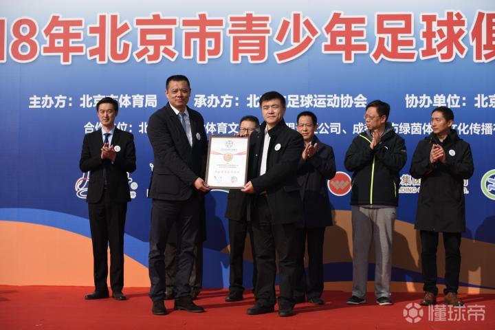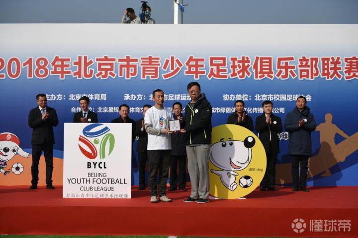 随着领导上台,大幕揭开,2018年北京市青少年足球俱乐部联赛会徽、吉祥物正式揭晓,杨海滨主席为设计者李伟先生颁发纪念牌。联赛会徽、吉祥物的设计将足球竞技比赛与文化传播紧密结合,全面提高赛事品质。