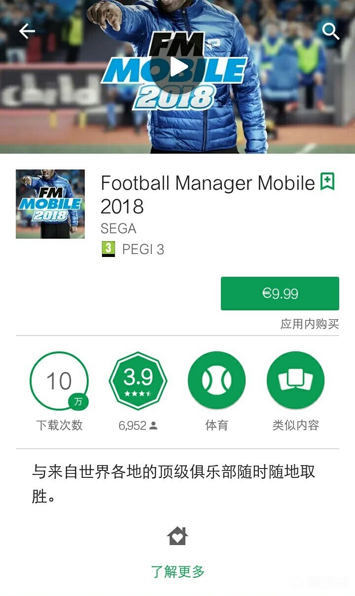 手机版的足球经理叫Football Manager Mobile 2018。在谷歌商店可以下载得到,但是它是付费的。而且功能很有限,所以不建议你在手机上玩。