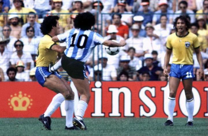 马拉多纳带球冲击巴西左路防区,他极具迷惑性的闪电般变向晃开了防守球员找到了缝隙,就在这个时候巴西的左后卫儒尼尼奥凶狠地将“疑似”突出禁区内的马拉多纳直接铲倒在地,点球!!!现场的观众甚至巴西球迷都绝望了,然而主裁判只是轻描淡写地示意“ok,马拉多纳,你去罚角球吧”。多次遭受侵犯、遭受不公的马拉多纳对裁判的判罚极其不解,受伤倒地的他顾不得伤痛立即站了起来,然后对裁判的不公正行为大吼大叫。从事后的慢镜头可以看到,儒尼尼奥几乎都没有铲到皮球,但有一点很确定的,他铲到了马拉多纳。