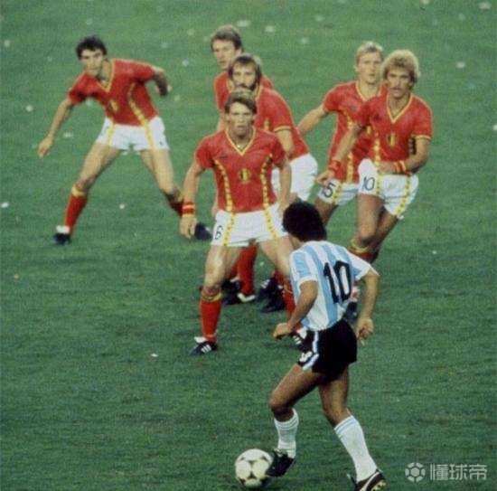 (1982年,vs比利时,留下了这张经典的照片,这里必须解释一下,图片的真相并不是真的以一敌六,而是当时主罚定位球的阿迪莱斯把球传给了靠近禁区的马拉多纳,此时人墙中的比利时球员正好侧向马拉多纳,摄影师准确抓住这一瞬间)