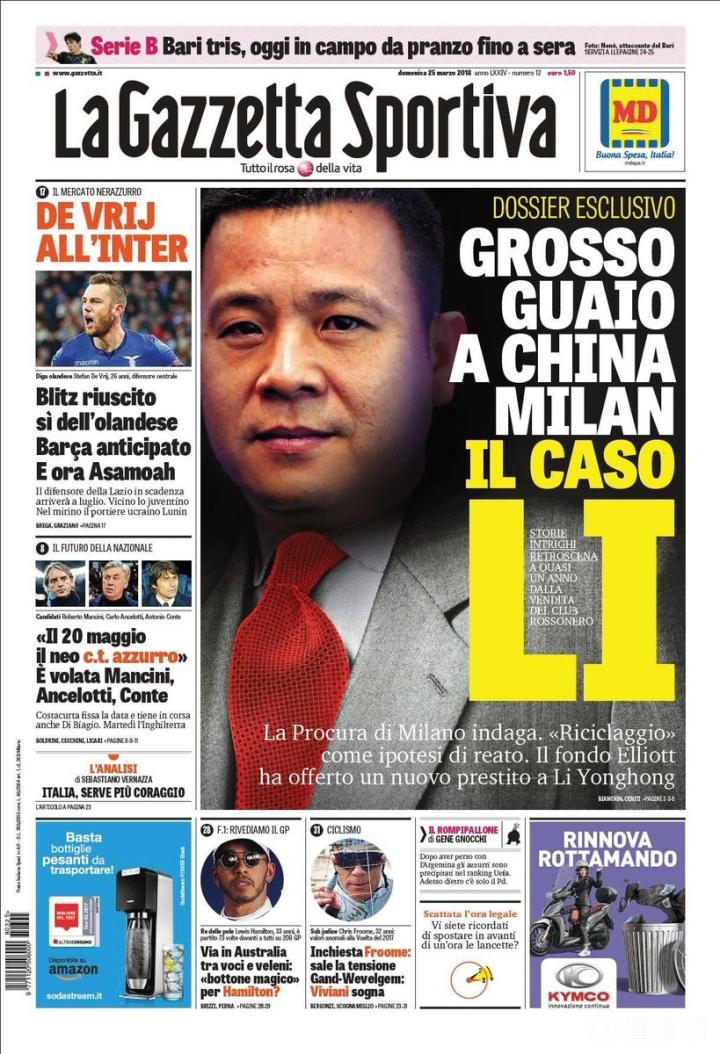 北京时间3月25日,意大利发行量最大的体育报纸《米兰体育报》发表专题文章回顾了米兰收购的全过程,并表示米兰检方已就洗钱假设对AC米兰俱乐部主席李勇鸿立案调查。