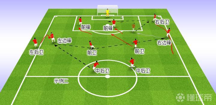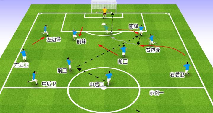 2)示例一:中前卫接到中后卫传球后,将球传给背对球门的前锋。前锋接球后将球传给内切跑动的右边锋,右边锋接球后完成射门。