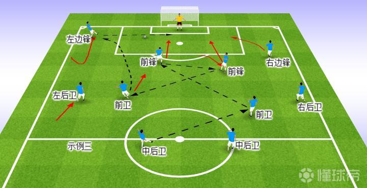 4)示例三:中后卫传球给右侧的中前卫,中前卫接球后迅速将球传给远端的前锋,远端前锋接球后一脚将球传给另一名前锋。另一名前锋接球后迅速将球回传给远端的另一名中前卫,中前卫接球后把球传给往底线跑动的左边锋,左边锋接球后迅速传中。