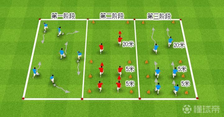 3)第三阶段(5分钟):球员先快速运球5米,再慢速运球5米,然后进行20米带球冲刺跑之后带球慢跑返回队尾。共做3组,每组之间间隔30秒。