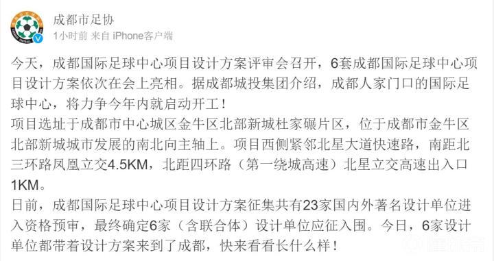成都足协在微博中写到:今天,成都国际足球中心项目设计方案评审会召开,6套成都国际足球中心项目设计方案依次在会上亮相。据成都城投集团介绍,成都人家门口的国际足球中心,将力争今年内就启动开工!