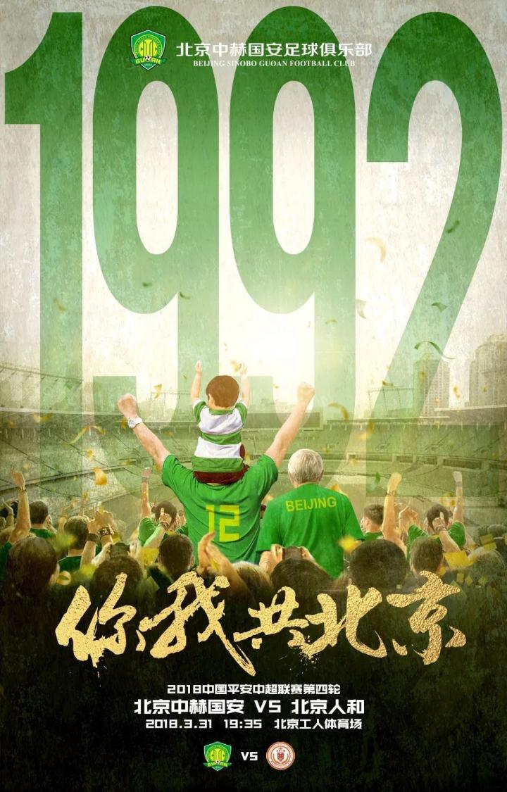 北京时间3月29日早上,北京中赫国安俱乐部官方公布了与北京人和的赛前海报,主题是:你我共北京。