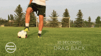 再用左脚脚底将球向后拉向身体,最后使用右脚外侧将球拨向右侧。