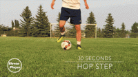 先用左脚脚底将球拉向身体右侧,同时跳起再用右脚内侧将球向身体前方推出。