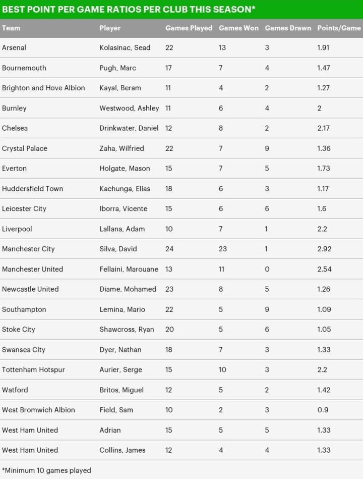 《每日邮报》专栏作者克里斯-卡特摩尔为我们统计了本赛季英超一项有趣的数据。在每支球队中,谁出场后球队的场均拿分最多?谁出场后球队的场均拿分又最少呢?让我们一起来看看英超各队的幸运儿和倒霉蛋。