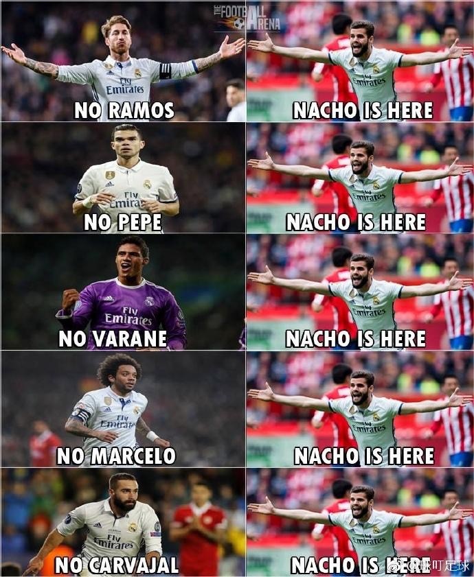 现如今的队内,纳乔是本赛季出勤次数最多的后卫(各项赛事35次出场)。在中后卫位置上,拉莫斯和瓦拉内都在赛季的不同时段出现过伤病而缺席过一段时间比赛,而另外一名巴列霍则是在很多时间都处于养伤状态中。纳乔本赛季在中后卫位置出战23次,打进了3粒联赛进球和1粒欧冠入球,而且在两翼位置上纳乔也有不错的发挥。由于卡瓦哈尔曾在赛季之初遭遇了心包炎的问题,而小将阿什拉夫在右边后卫位置上的表现并不让人很放心,马塞洛则是在9月底和二月底分别遭遇肌肉伤病和腿筋伤势,因此纳乔在某些场次还得驰援边路,这位后场万金油在左后卫和右后卫的位置上分别出场4次,表现可谓是可圈可点。也正是因为纳乔有着如此精彩的发挥,才会有球迷做出这样一幅图来称赞纳乔。