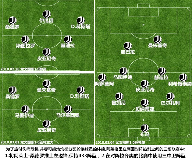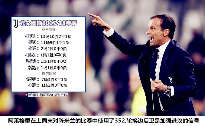 尽管也曾在上赛季做客摩纳哥和本季联赛对拉齐奥、AC米兰的比赛中使用过三中卫阵型,但尤文图斯在近一年来的绝大多数比赛中使用的都是四后卫阵型。在4231体系进入瓶颈期之后,阿莱格里依靠马图伊迪变阵433,其为了应付伤病危机研发的442切换433战法,已经在做客温布利的比赛中收获了好评。