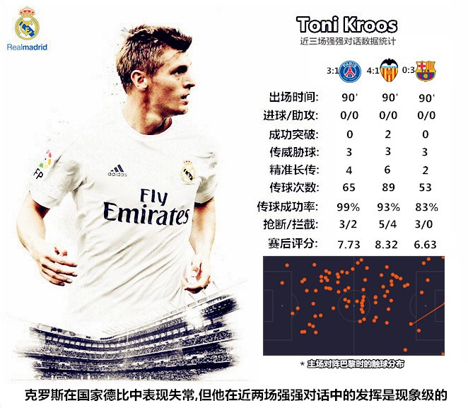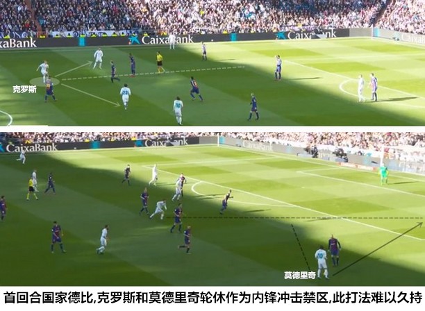 由于前场球员的持球进攻能力退化明显,齐达内现阶段更倾向于选择穆里尼奥时期的层次型反击,而不是打安切洛蒂时期简明迅捷的纵向突击。克罗斯和伊斯科之间的打法兼容问题尚不至于影响两人的共存,克罗斯无死角的传球能力可以保证他在参与局部渗透的同时,随时利用斜传开发弱侧空间、完成提速。克罗斯对空间的利用和在承压情况下的处理球,莫德里奇利用盘带突破防守的能力,对于很可能将在客场承受巨大压力的皇马来说是不可或缺的。