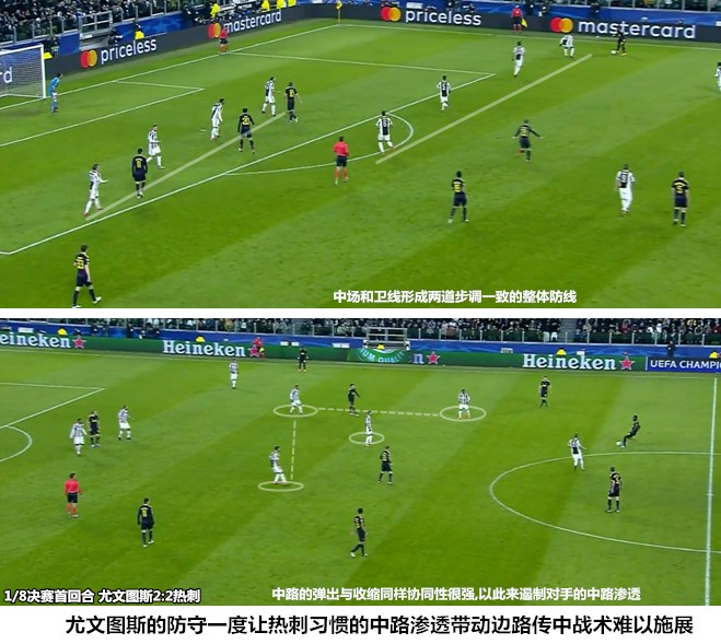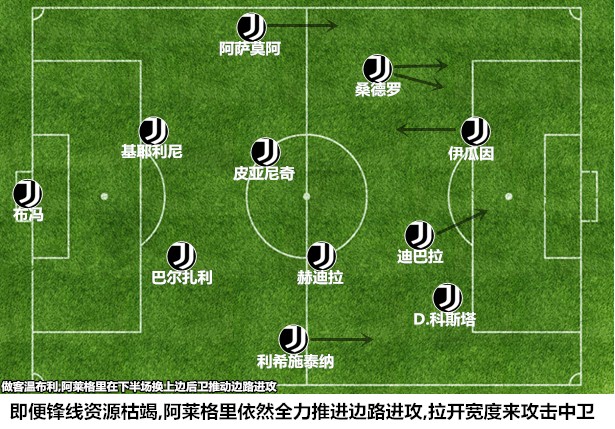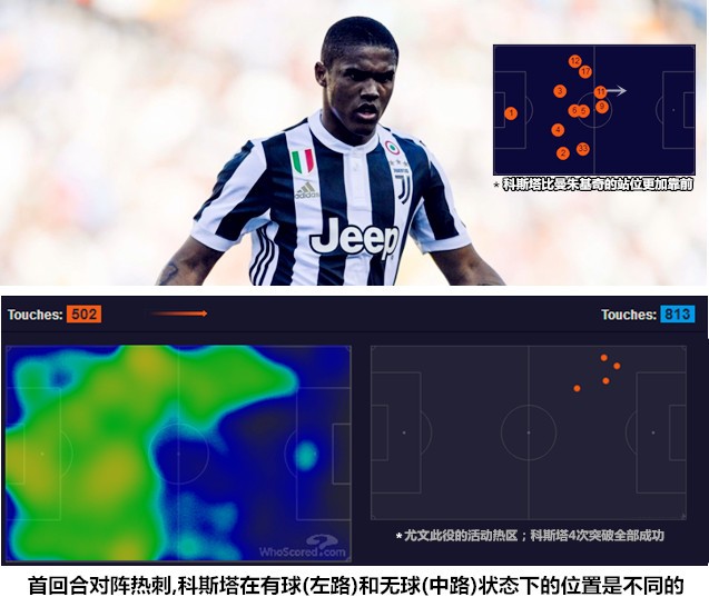 变阵四后卫之后的尤文图斯对边路的利用率较之过往提升了不少,上赛季只有夸德拉多一名反击快马,包括伊瓜因、迪巴拉和皮亚尼奇在内的主要攻击手都更加擅长阵地战法,他们缺少执行长程反击的速度和冲击力,深度防守后的阵型弹开和组织推进是摆在阿莱格里面前的一道难题,具备高点优势的曼朱基奇因为能够简化推进而占据了一个边路先发位置。随着道格拉斯-科斯塔和贝尔纳代斯基的不断进步,斑马军团的两翼进攻不再拘泥于“右路传中、左路支撑”的固定模式,巴西人凭借超强的盘带和能边能中的特点让尤文图斯在终端的进攻产生了更多的变化和横向联系。