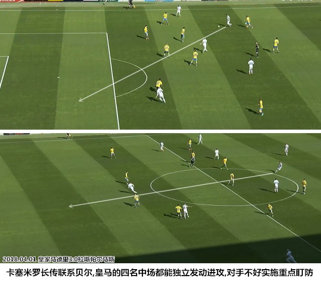 (中路防守门户洞开的现象在皇马身上也是时有发生。卡塞米罗容易被对手调离中路防区,莫德里奇和克罗斯在这个时候需要保持高度警觉。)