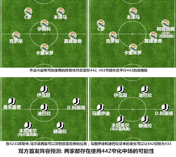 尤文图斯是欧冠八强中最难以捉摸、组织结构最为多变的球队,近期的不利局面反而给了阿莱格里再当救世主的机会。不同与阿莱格里的被动轮换,齐达内在近期的用兵遵循的是两点原则,即在联赛中尽可能地平衡各方面的关系,在保证战术试验效果的同时,尽可能多地给替补球员机会,但在欧冠赛场,他的用兵则不会受到非竞技因素的干扰。在赛前备战阶段,齐达内需要综合考量两种442体系的优劣,精确计算伊斯科、贝尔、阿森西奥和巴斯克斯这些负责“接力跑”球员的体能储备,并充分评估己方两套方案与对手两种战法之间的博弈关系,从而排出首发阵容并初步拟定替补球员的出场顺位和时间点。