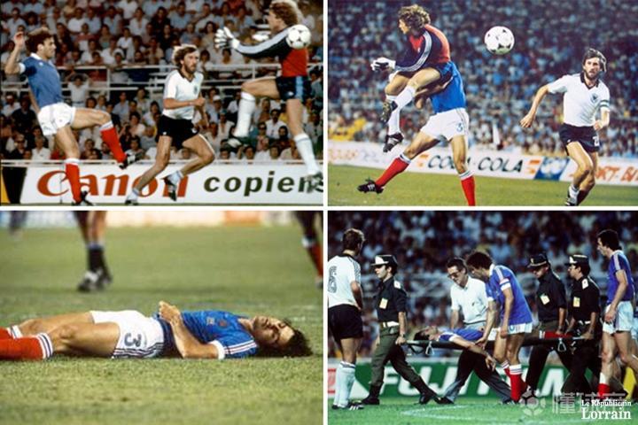 当时联邦德国队门将哈拉德·舒马赫和法国后卫巴蒂斯顿同时跑向一个长传球的落点,巴蒂斯顿抢先一步将球踢出,舒马赫此时已经跳起,顺势扑向巴蒂斯顿。
