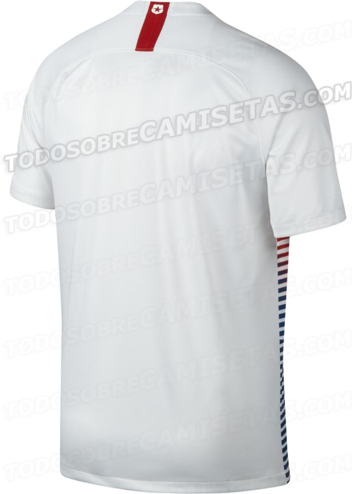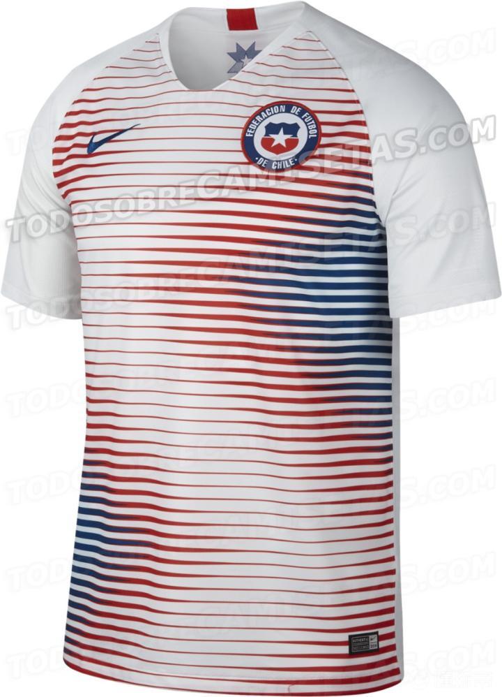 客场球衣则以白色为主色调,球衣正面加入红蓝两色渐变水平横纹,并采用动感十足的形象,让球衣看起来如同飘扬的智利国旗。球衣衣领内与透气织带上均加入与主场球衣相同的图案设计。