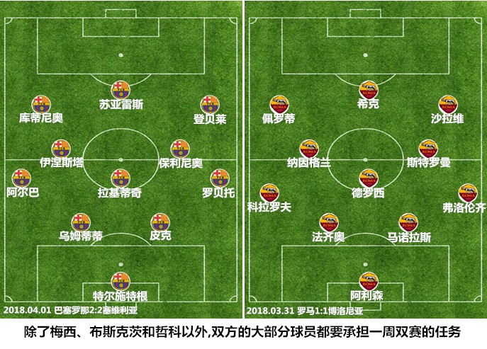 巴塞罗那和罗马之间的较量一度被认为是1/4决赛阶段最没有悬念的一组对决:这一方面是因为巴尔韦德治下的红蓝军团在联赛和欧冠双线至今保持不败,以梅西为绝对核心的建队模式展现出了很强的竞争力,阿根廷人总能在球队需要他的时候拿出现象级的表演,伊涅斯塔和皮克等老将在联赛压力不大的情况下,也能更好地将精力转移到欧冠中;另一方面就是罗马在欧冠对垒顶尖强队的战绩十分惨淡,迪弗朗西斯科打造的这支红狼战术务实但风格不够突出,这在一定程度上影响了他们的曝光率。