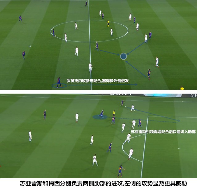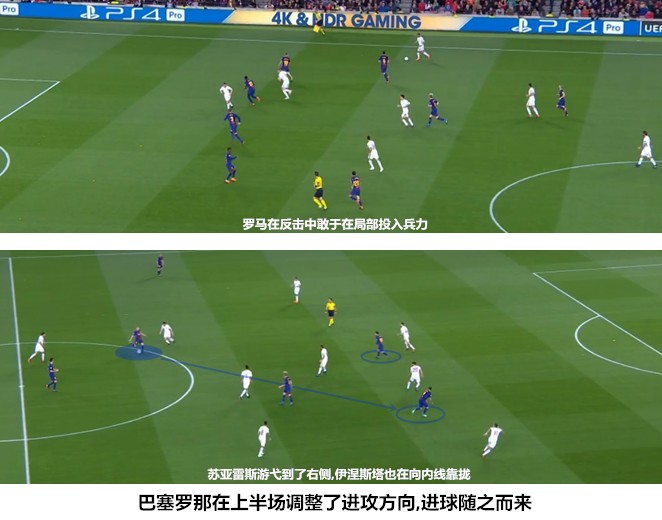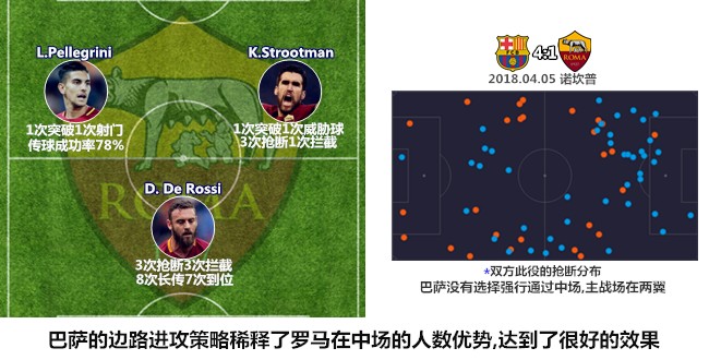 基于服务边路进攻的考量,苏亚雷斯和梅西在两侧肋部的活动十分频繁。前者在开场后不久就主动回撤参与配合,并连续从佩雷斯和马诺拉斯的结合部杀入禁区,后者与拉基蒂奇、罗贝托和塞梅多在右侧聚集,很好地限制了罗马强势左翼的进攻。相比之下,巴萨的左路因为伊涅斯塔的存在而更具威胁,右路的塞梅罗和罗贝托组合无法形成连续配合,葡萄牙人在大场面下的传球选择还不够好,梅西随着比赛的深入不断左倾加剧了两翼攻势的不对等。